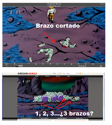 Pertenece a la escena de cuando freezer se corta en dos con su disco infernal, que se corta de cintura para abajo llevandose por medio tambien un brazo. pero en otra escena se ve a freezer tumbrado con los dos brazos intactos....pero ademas tambien le han dibujado el brazo cortado?
